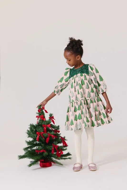 This festive Pink Christmas Tree Dress is perfect for any holiday occasion. With its playful pink chicken design, puff sleeves, and green sequin accents, your little girl will feel like the life of the party. Made with high-quality materials for lasting comfort and style.