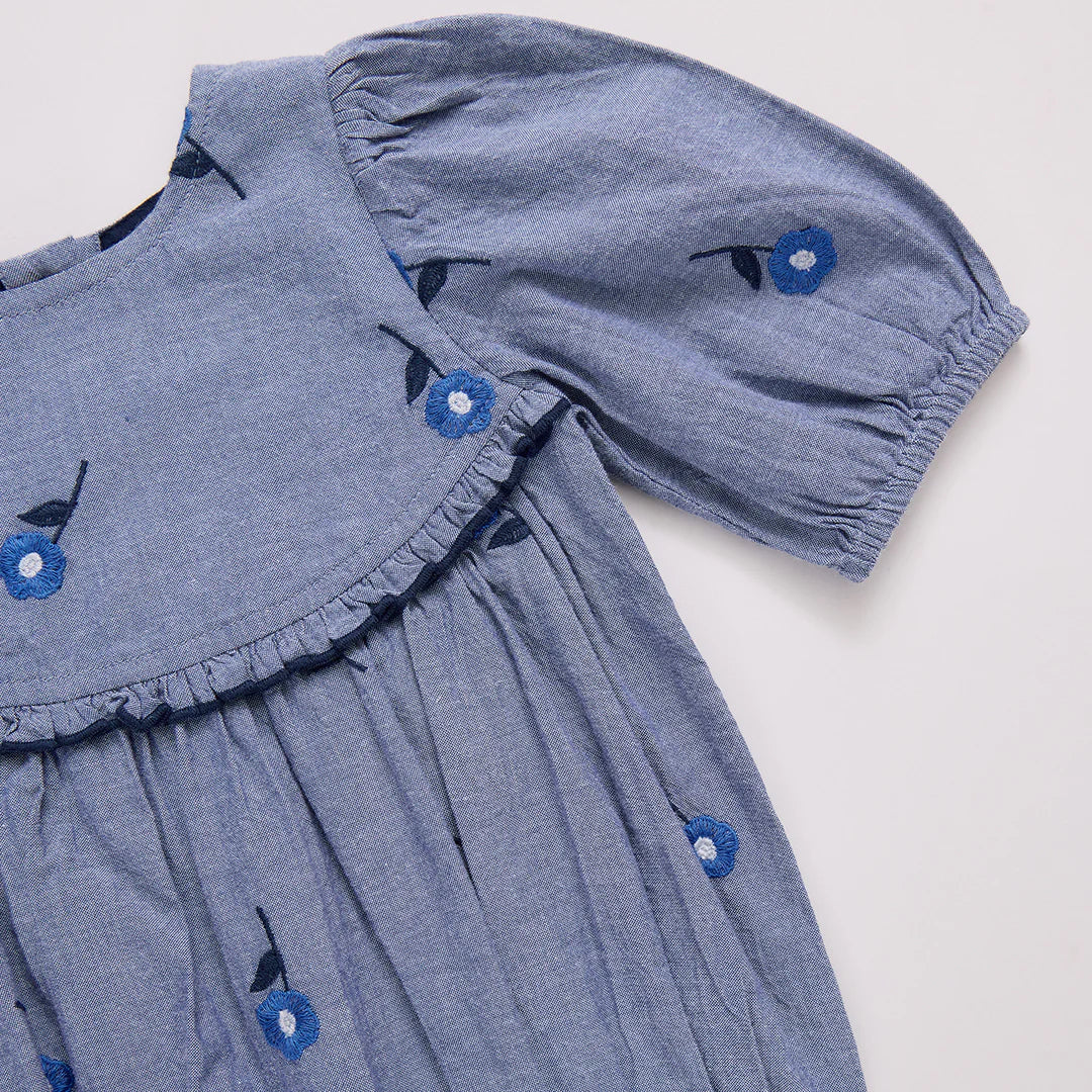 Delicate Flowers! A scattering of sweet daisies bloom from a classic chambray ground in our Blue Blossom Embroidery shown here on our Baby Girls Rowan Bubble. Design highlights include a pearl stitched, curved ruffle detail at the chest and back, a 3/4 puff sleeve and our signature glitter buttons at the back. Ring snap closure at the leg allows for easy diapering. Match back to Big Sis in our Girls Fiona Dress.
