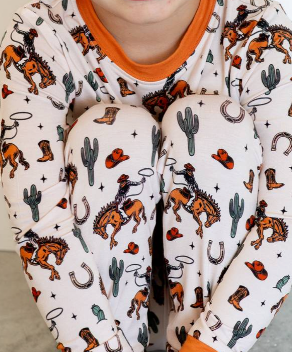 Get your little one ready for a cozy Halloween night in our Rodeo Rider jammies! Made from 95% bamboo viscose and 5% spandex, these jammies are unbelievably soft, breathable, and stretchy—designed to keep your child comfy without feeling too tight or too loose.