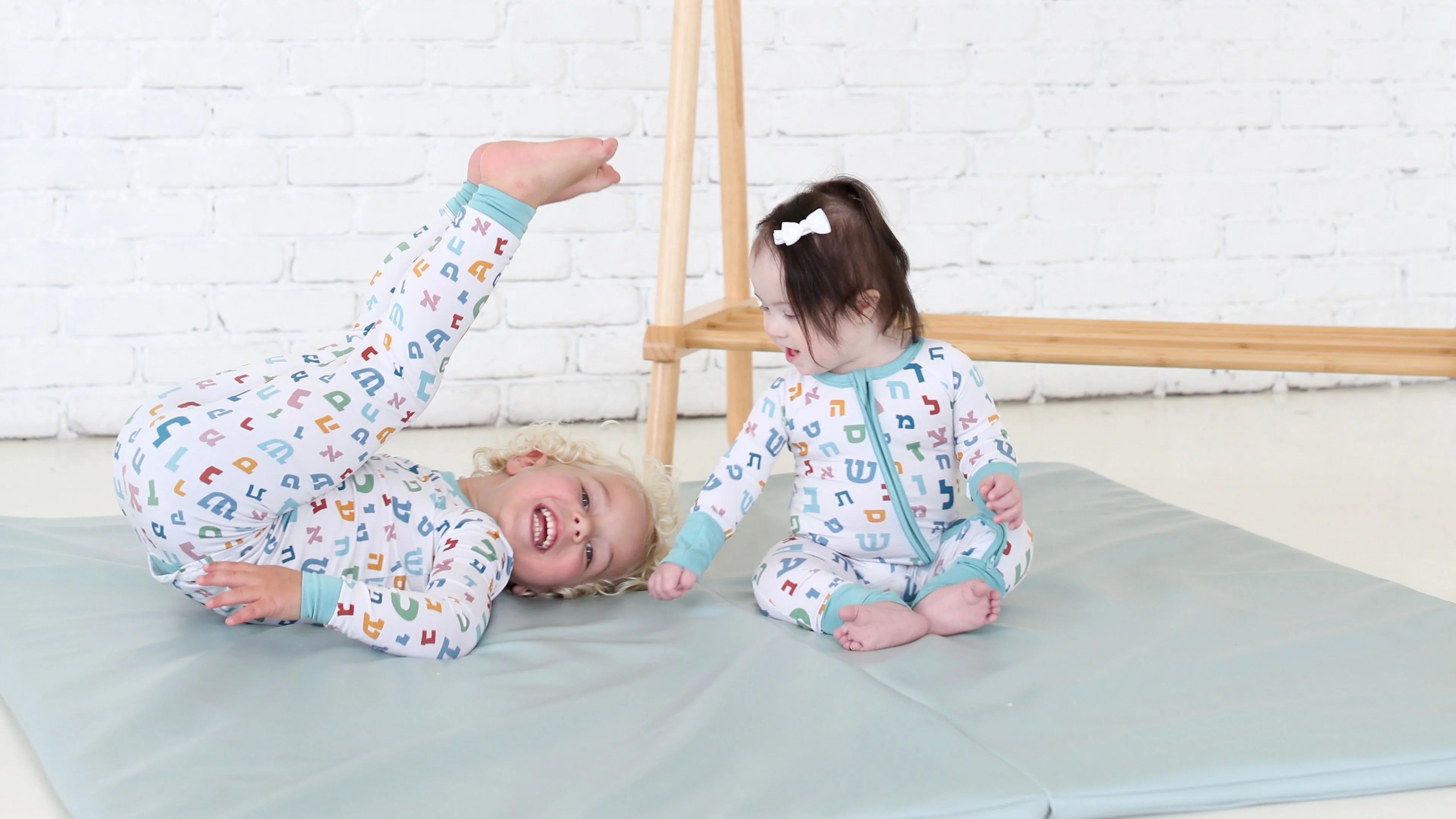 Our Aleph Bet Zippy pajama features a vibrant mix of colorful Hebrew letters, bringing the beauty of the aleph-bet to life. The bold, playful design makes learning and recognizing Hebrew letters part of the everyday routine. It’s a joyful way to connect with language, culture, and identity.