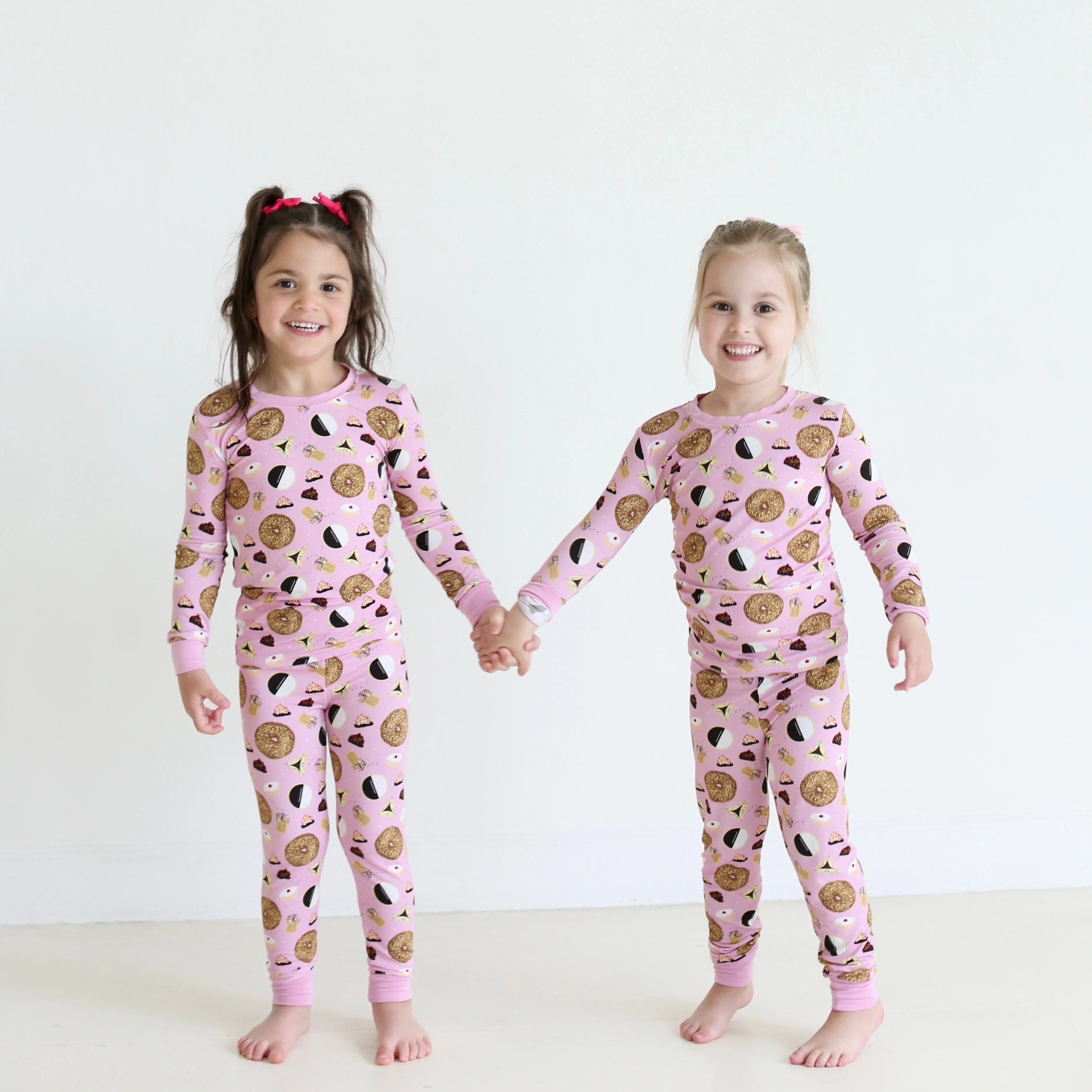 Our Jewish Treats toddler pajama is covered in everyone's favorite baked goods — from bagels and black & white cookies to hamantaschen and macaroons. The playful, food-inspired print brings a taste of tradition to bedtime. Familiar and fun, it’s a sweet nod to classic Jewish treats kids love.