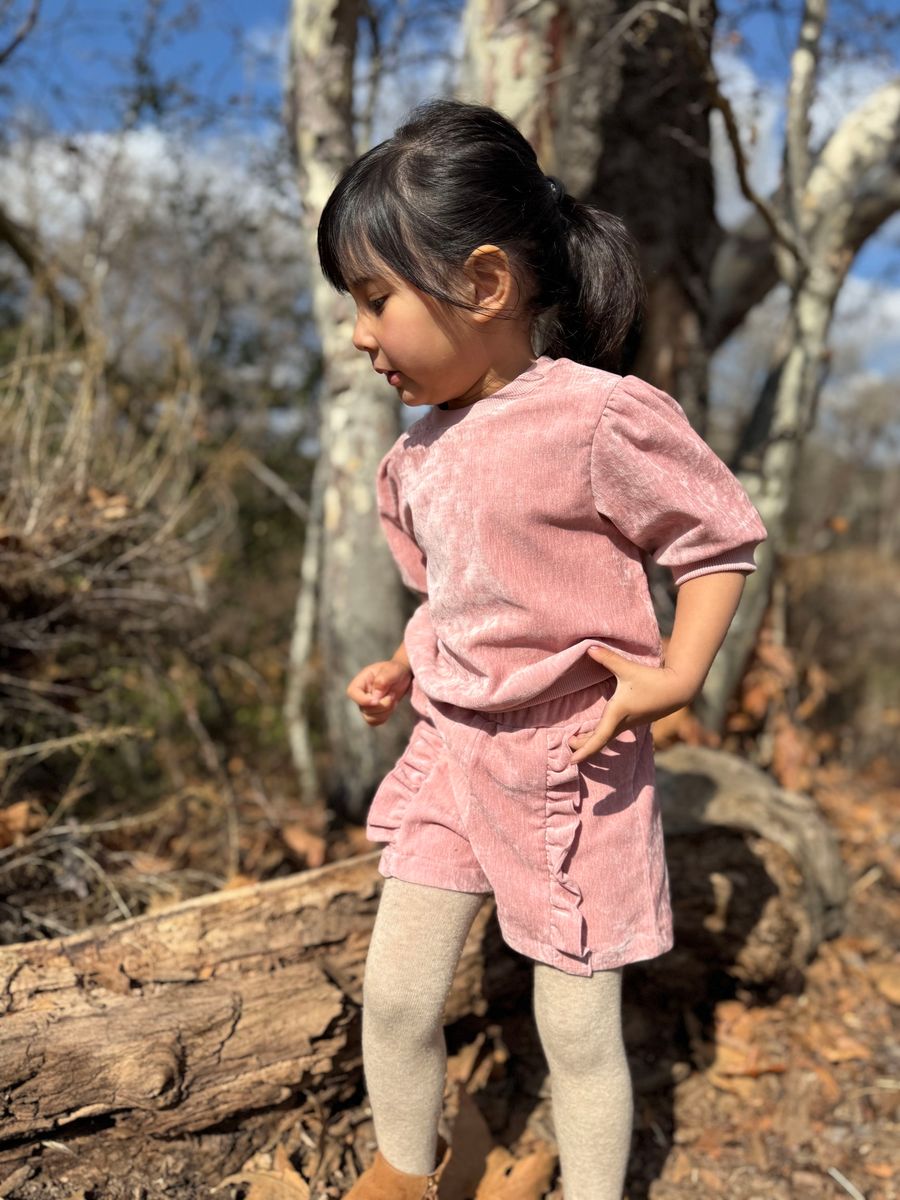 Adorable paisley shorts that'll have your little one twirling in style! Crafted from soft chenille in a gorgeous rose hue, these shorts feature a charming ruffle detail running down the front for extra flair. Perfect for playdates, family outings, or just everyday cuteness. The cozy fabric keeps them comfy all day long, while the playful design adds personality to any outfit. A wardrobe essential that's as sweet as it is stylish!